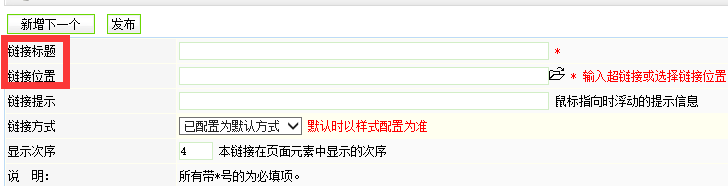 需要新增链接时,点击新增代表一个一个的增加,批量新增可以一次新增好多条把链接标题和链接位置(链接地址),填写好点击发布就可以新增(如下图)