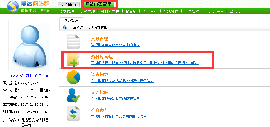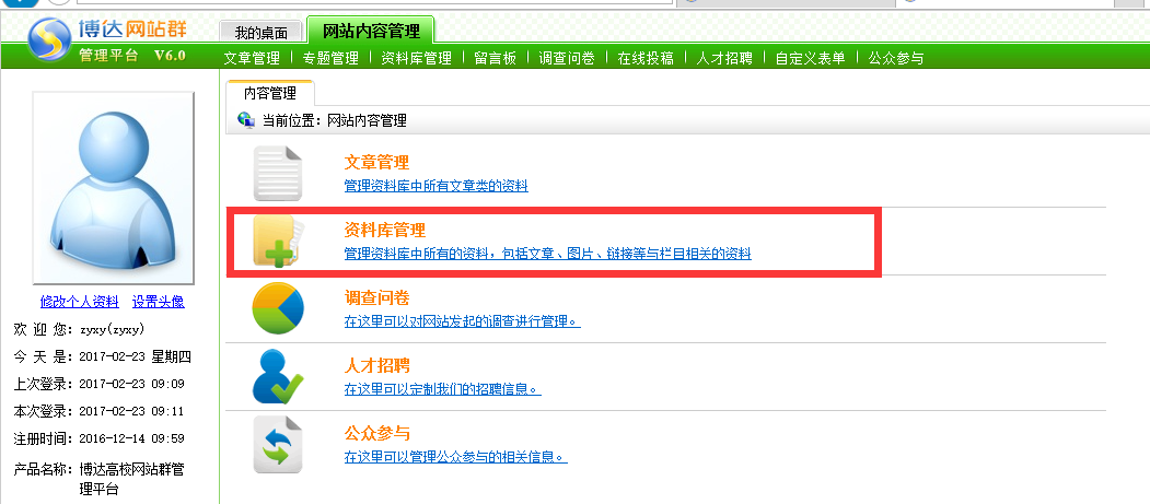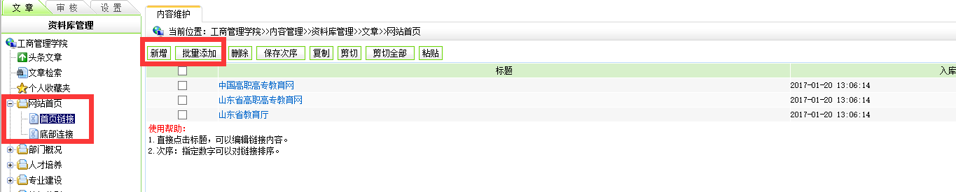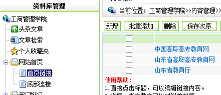 有些网站的底部会有友情链接,需要增加或者修改删除链接时候,需要回到网站内容管理界面,点击资料库管理