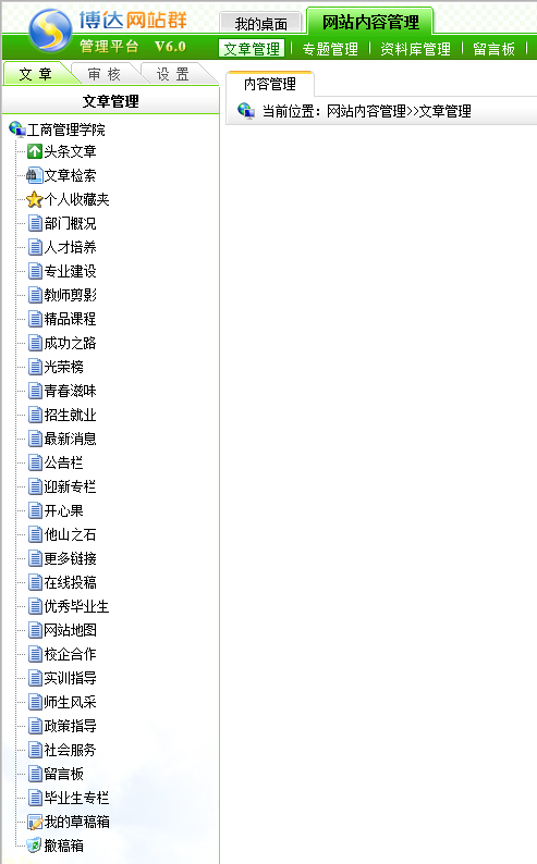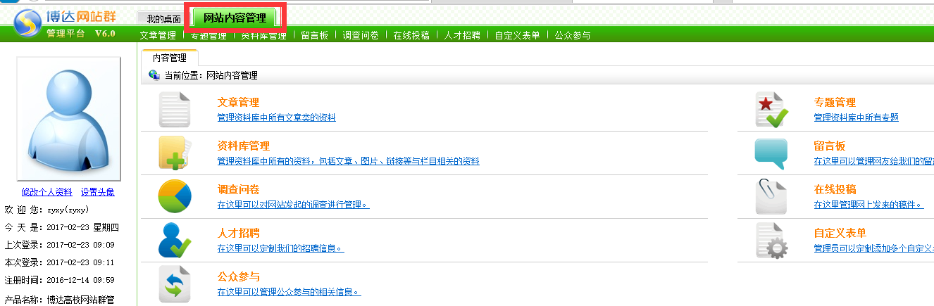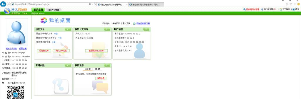 2.用分配给各学院的账号和密码登录进去,进入站群后台,如下图(这是我的桌面页面)