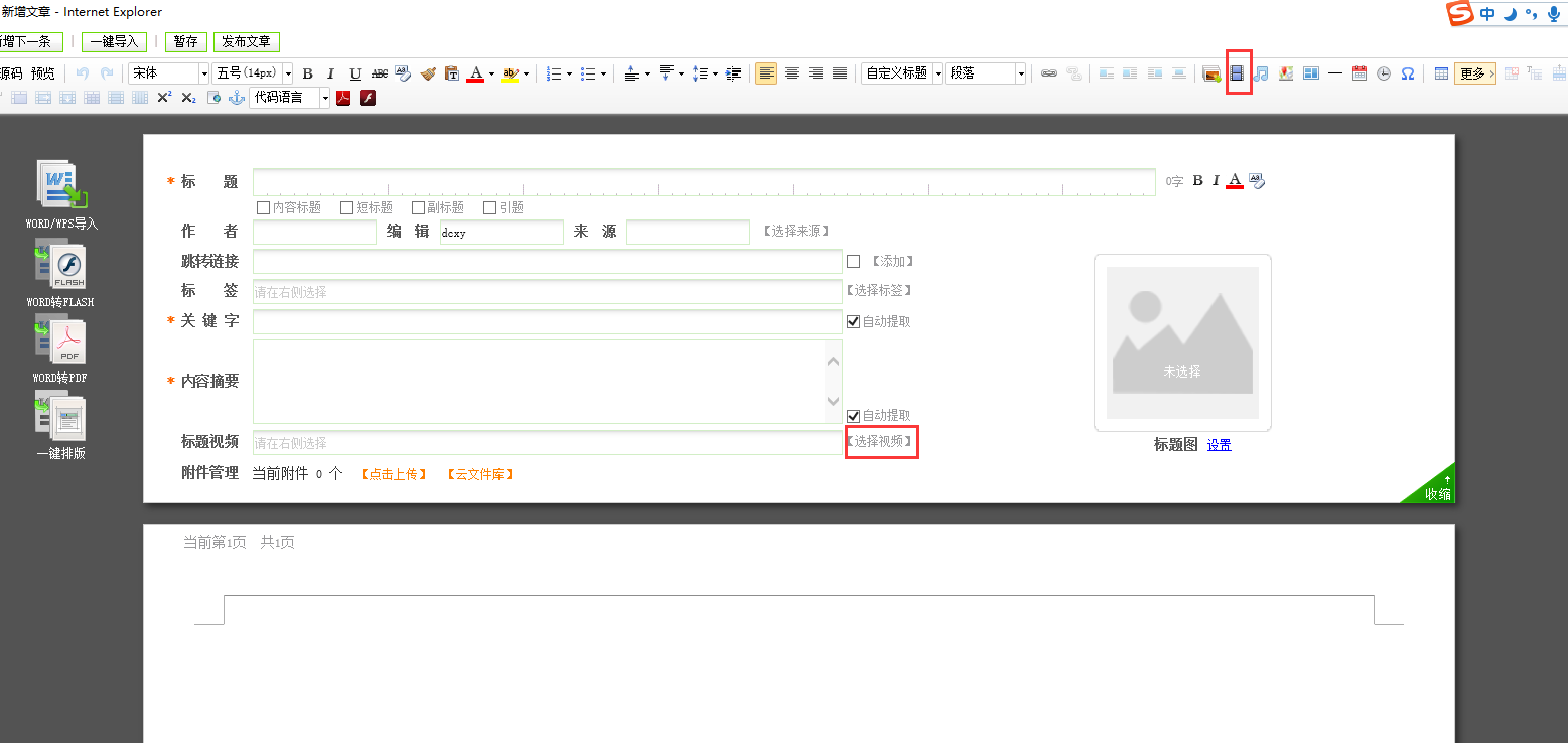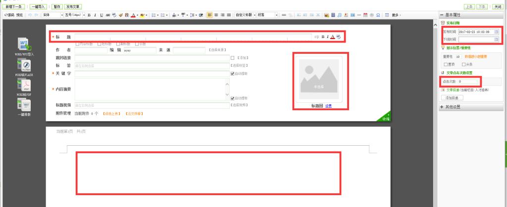填写好文章标题、作者,如果这个文章在网页列表展示的时候有图片缩略图的话,就把标题图也上传上图片,