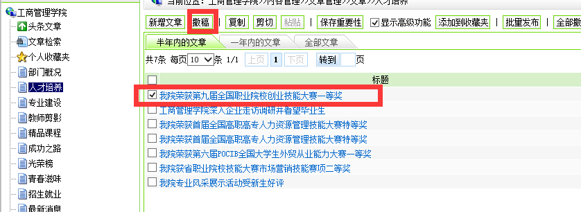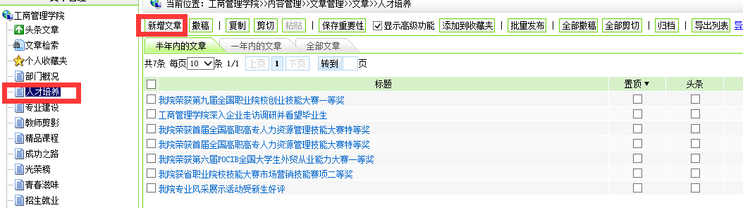 比方说想要在“人才培养”栏目下新增文章,就点击“人才培养”栏目,右侧就会出现当前栏目下的所有文章,点击新增文章就可以添加新文章,如下图